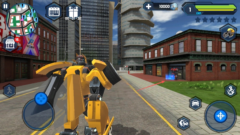 进入游戏后,操控黄色机器人,借助左下角的蓝色虚拟摇杆进行移动,熟悉城市的环境,同时留意左上角的小地图来了解自身位置。