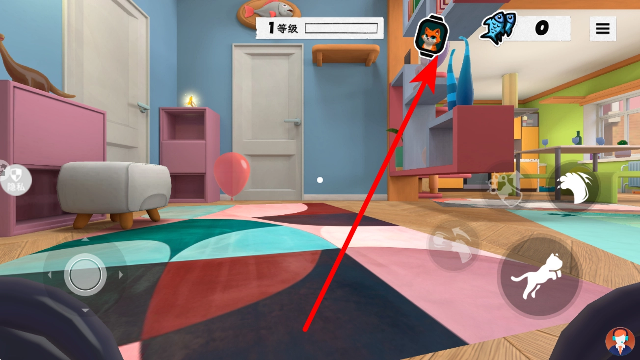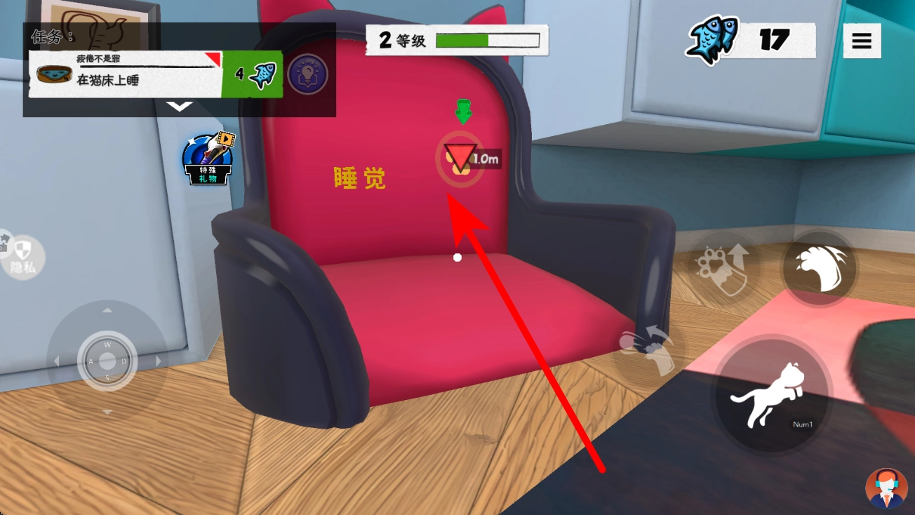 新手在完成“疲倦不是罪”任务后,查看任务栏的指引,操控宠物进行移动,按照箭头提示去寻找猫床,靠近显示有睡觉标识的猫床,准备进行互动。