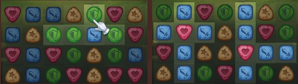 当4个符文连成一条直线,或者5个符文组合成L型或T型并消除时,会触发1次技能1,并且还会生成1个技能符文。把技能符文消除后,对应的英雄就会触发技能2。