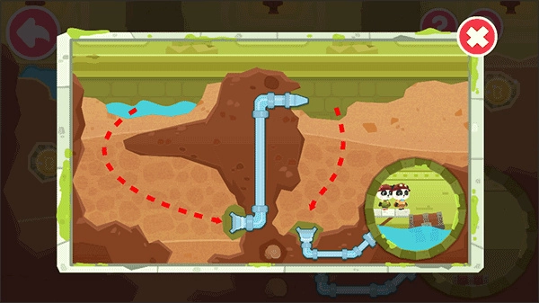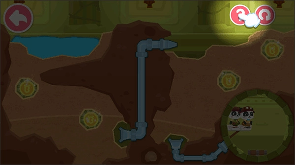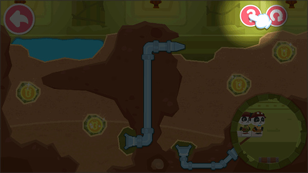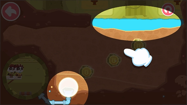 怎样才能获得洞底的宝箱呢?有办法了,规划水流路径,利用水的浮力,让宝箱浮上来!那么,如何规划水流路线呢?挖掘土块,控制水的方向。前方有障碍物,注意躲避哦。这一环节的设计,不但考验了宝宝的应变能力,还将测一测宝宝的空间布局能力。