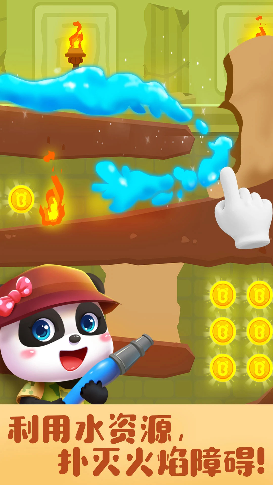 除了可以运用知识“引水”通关,宝宝们还可以寻找闯关道具来助力。石块挡住了水的流动路径,这可怎么办呢?小小地雷来帮忙。引水启动,砰!一定范围内的障碍物全部消失啦。还有手动操作的移动容器、水车机关……宝宝们,都来解锁试试吧。