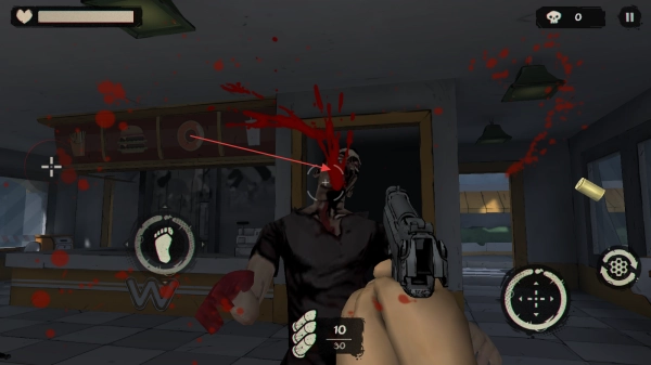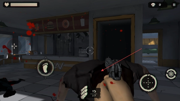 在探索途中遭遇僵尸时,可通过滑动屏幕来调整瞄准角度,点击射击按键即可对僵尸发起攻击,同时要随时留意上方的生命值,以防被僵尸攻击。