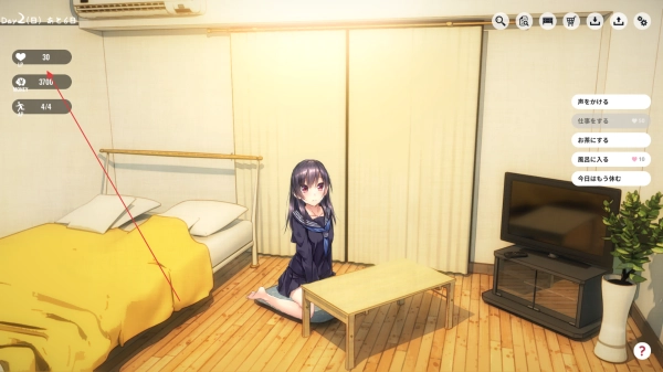 请留意屏幕左侧显示的爱心数值,它代表着好感度,同时那里也会显示金币和步数等信息。你可以通过合理的互动与行动来提升好感度。