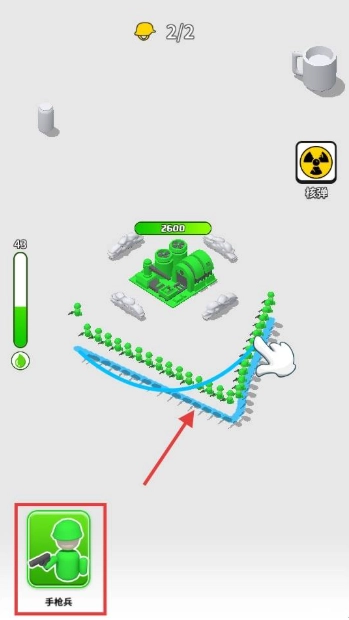 2、点击手枪兵图标召唤小兵,沿蓝色路径部署,规划进攻或防御阵线推进战斗。
