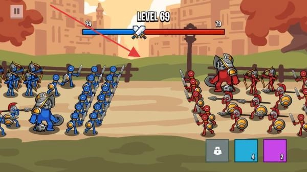 战斗时,操控蓝方巨人承担伤害,弓箭手在后排集中火力,点击下方技能图标,冲破红方阵线,紧盯血条,扭转战局。