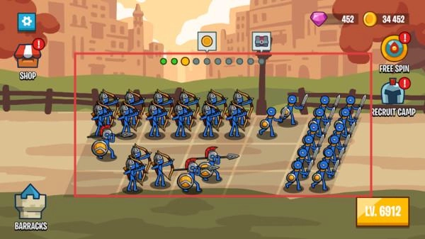 在兵营界面,通过征兵营地扩充兵力,升级蓝方弓箭手、剑士等兵种,搭配阵容提升整体战力。
