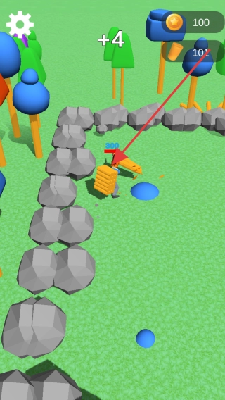 操控角色靠近灰色石头,采集后能获得【+4】资源,不断积累石头数量,为后续建造建筑储备所需材料,同时避开周边的障碍,稳步推进游戏进程。