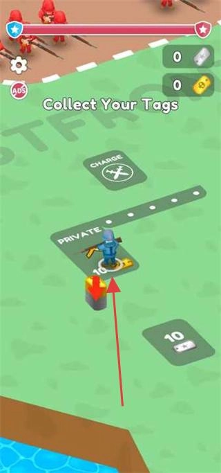 点击红色箭头样式的“箱子”,收集其中的“Tags”;这些“Tags”可用来招募士兵、提升兵种等级,助力蓝色军队发展壮大,以对抗红色敌军。