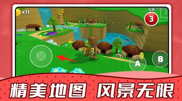 进入游戏后,操控图1中的小熊,在图2所示的村庄地图里,通过左摇杆控制移动,先熟悉场景环境,同时收集11枚金币。