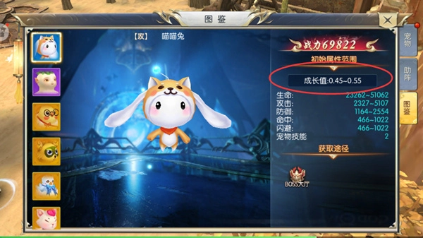 这里需要玩家留意的是,每只宠物都具备对应的成长值,而成长值会对宠物带来的属性加成效果产生影响。(因此在培育每只宠物之前,别忘了查看一下成长值的高低哦。)