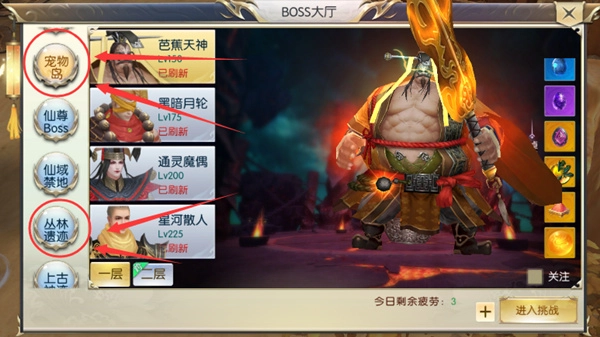 上面这张图里,两个地图中的BOSS都能让玩家获得宠物以及宠物装备。(因为每天进入的次数是有限制的,所以建议各位玩家每天都主动参与,千万不要浪费了次数。)