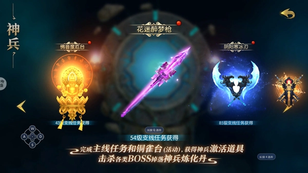 大部分神兵能直接通过等级支线任务获取,只要完成一次神兵秘境挑战就能拿到手。另外还有部分神兵是通过参与铜雀台活动来获得的。