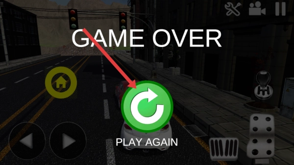 当游戏失败出现GAME OVER提示时,点击带有绿色循环箭头标识的PLAY AGAIN按钮,即可重新开启当前关卡的挑战。