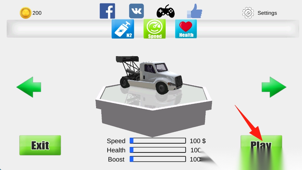 在车辆界面使用金币升级速度、血量等属性,提升卡车的竞速表现后再去参赛。