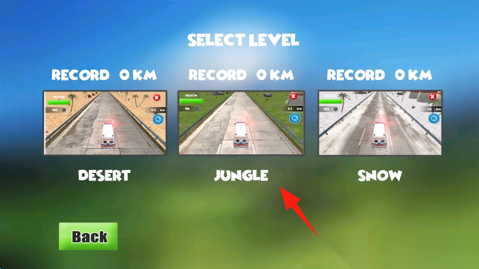 点击“Play”按钮进入游戏后,选择沙漠、丛林等不同类型的赛道,并开启搭配模式,即可参与卡车竞速挑战。