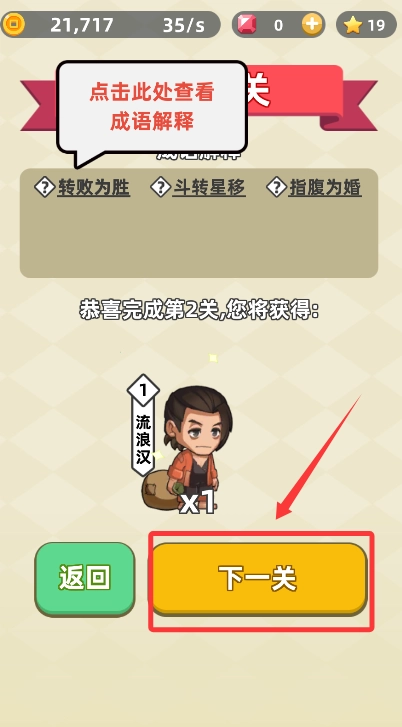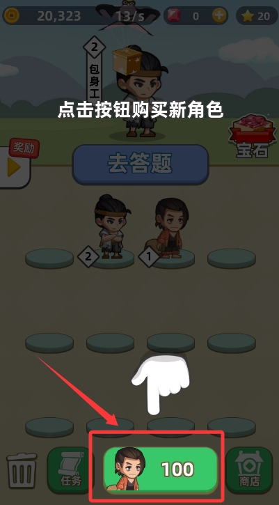 在游戏刚开始的时候,你可以点击按钮来购买新角色,这样就能让你的成语挑战阵容变得更丰富。