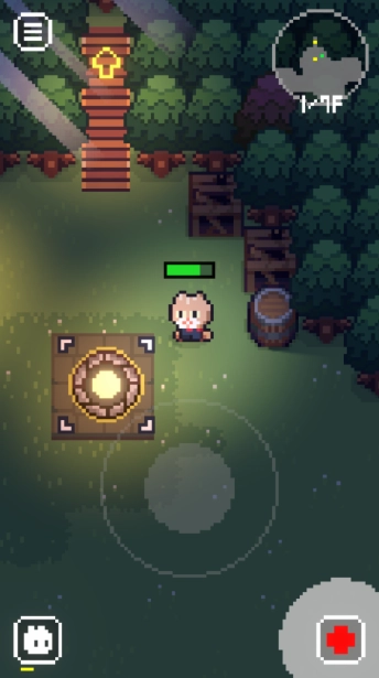2、在游戏过程中,玩家可借助虚拟摇杆操控小猫奶酪在森林里展开探险,要么击败所有敌人深入到更下一层,要么带着收集到的资源返回原处。