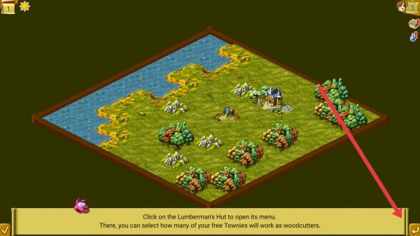在游戏场景里,按照提示点击伐木屋(Lumberman's-Hut),关闭弹出的对话框后,打开菜单来设置伐木工的数量。