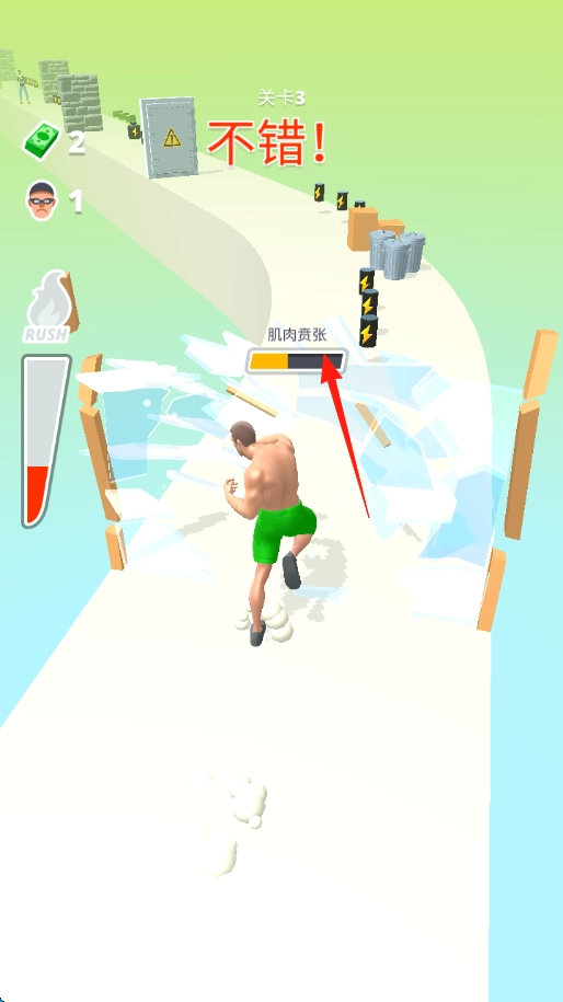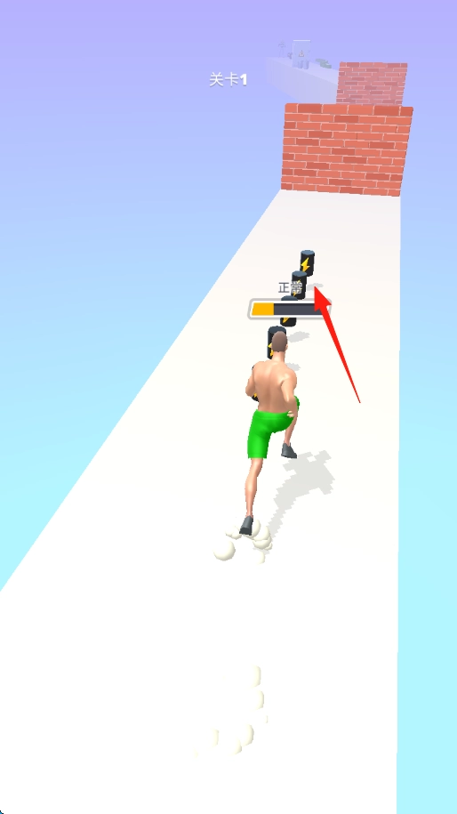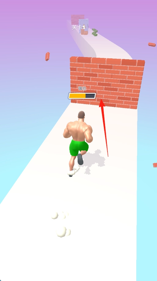 操控肌肉发达的男性角色,沿着跑道全力冲刺;当遇到砖墙时,屏幕会显示代表强壮程度的进度条,此时需持续保持冲刺状态,撞碎前方的障碍物,并收集沿途出现的道具。