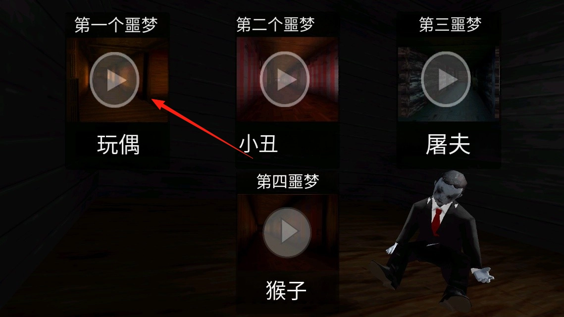 进入《黑暗欺骗2D》游戏后,找到第一个噩梦玩偶,点击它对应的播放按钮就能进入相应的恐怖关卡。在光线昏暗的场景里,你会遇到和玩偶有关的恐怖元素,需要探索周围环境来躲避危险,亲身感受以噩梦为主题的游戏玩法。