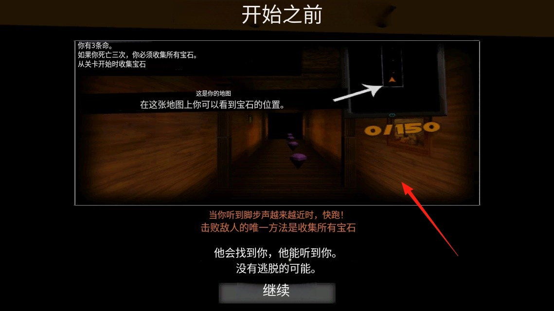 在开始游戏前,请先查看规则说明,了解生命宝石收集等相关机制。随后点击“继续”进入关卡,按照规则收集宝石并躲避敌人,尽情体验生存冒险的玩法。