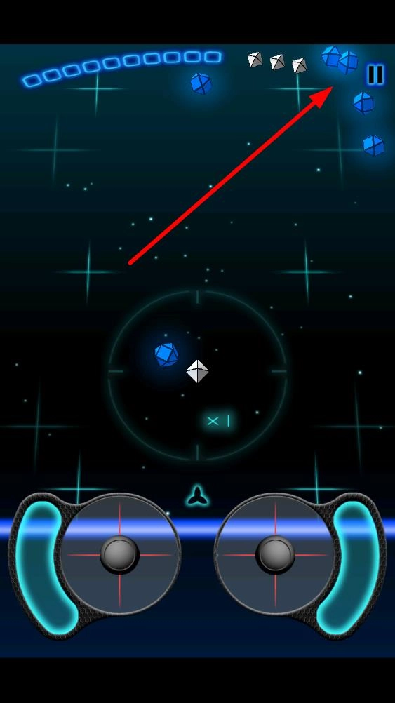 控制飞船,瞄准箭头所指的蓝色方块进行射击,同时收集各类道具,并注意躲避途中的危险。