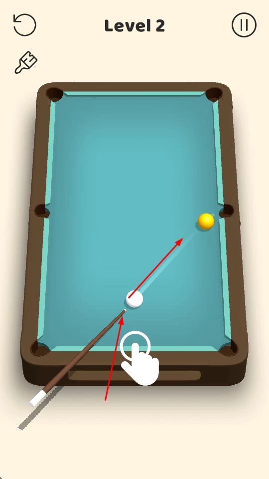 进入游戏后,在台球桌场景里,你可以通过滑动屏幕之类的操作来操控球杆,去击打白色的母球,让它碰撞到其他颜色的目标球。