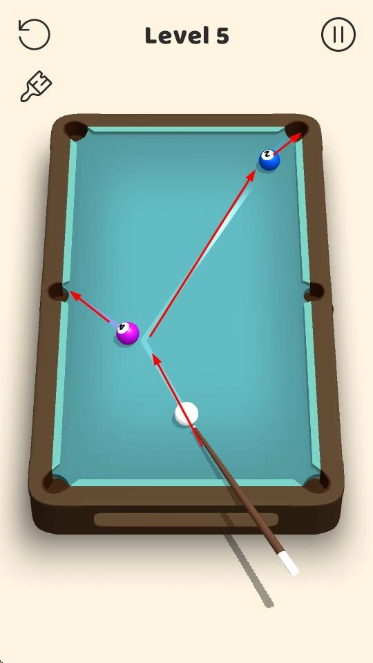 随着关卡的逐步推进,台球桌上目标球的数量与摆放位置会愈发复杂,这就要求玩家更精准地计算击球的角度和力度,从而完成关卡任务,顺利将目标球打入球袋。