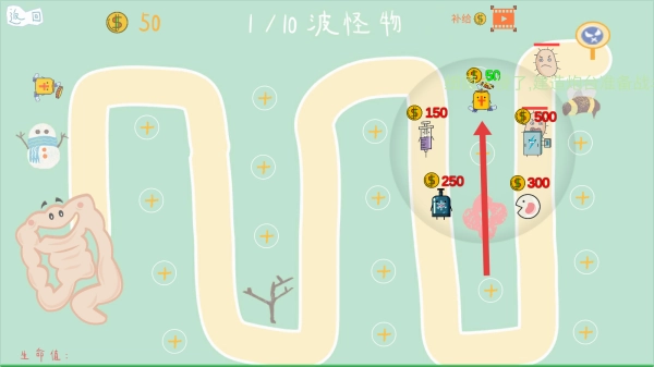 战斗时,在路径旁边的空位里挑选合适的位置,花费金币放置防御塔,利用不同防御塔的独特功能来抵挡一波又一波细菌的进攻。