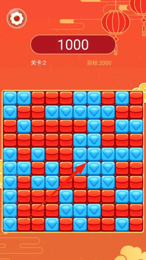 在第一关里,点击相邻的相同颜色方块,像蓝色钻石或者黄色元宝这类,就能让它们消除,当积累的分数达到1000分的时候就可以通关了。