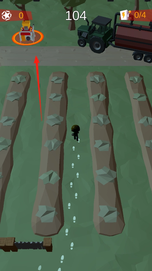 打开游戏进入主界面后,操控角色沿着脚印指引的路径前进,穿过树林区域,逐步靠近带有红圈标识的目标机器。