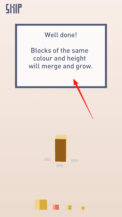 完成搭建步骤后,系统提示同色且高度相同的方块会合并并长高。观察场中的方块,当出现颜色和高度一致的方块时,它们会自动融合,变得更高更大。可以利用这一机制,合理规划方块的摆放位置。