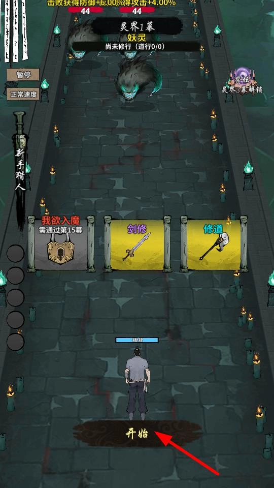 在修仙题材游戏的灵界关卡里,点击开始按钮就能开启战斗,界面上可以挑选剑修或者修道这类职业,不一样的职业具备不同的战斗风格与技能体系。