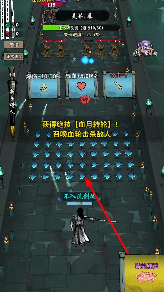 习得绝技血月转轮,此绝技能召唤血轮斩杀敌人,属于强力战斗技能,施展该绝技可迅速消灭大批敌人,于紧要关头改变了战局走向。