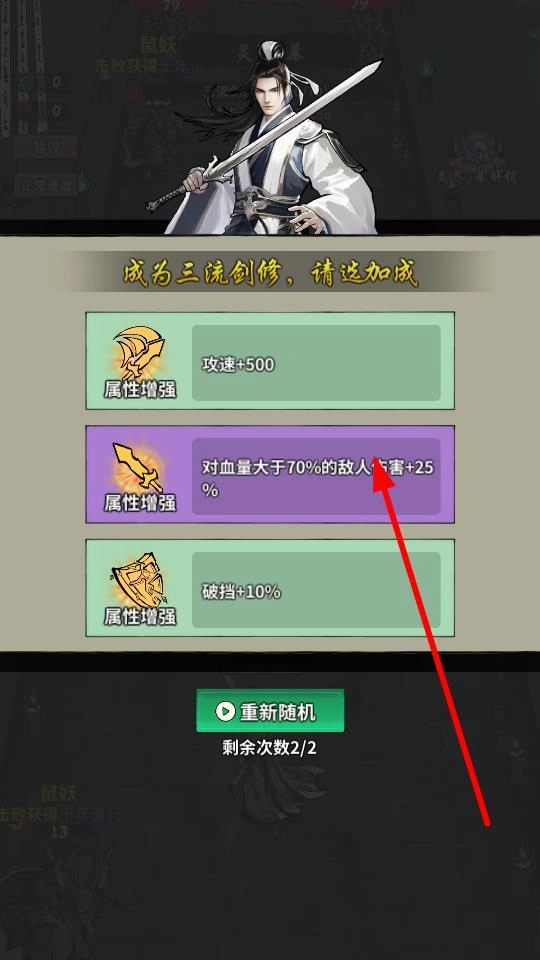 晋升为三流剑修时,可挑选对血量超过70%的敌人增加25%伤害的属性强化,此加成能让你对高血量敌人打出更高伤害,从而完善战斗策略。