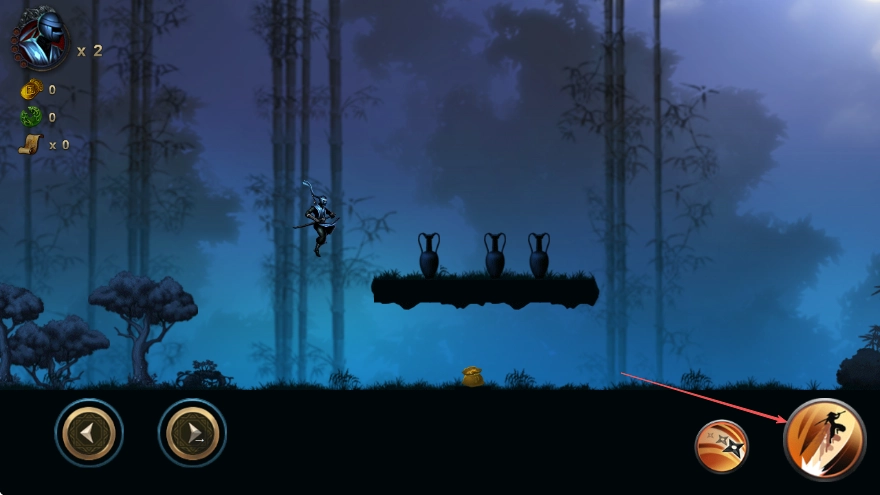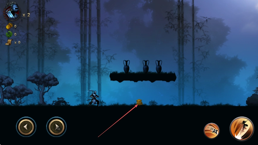 进入游戏后,你可以借助左下角的左右移动按钮来操控忍者战士进行移动,从而探索整个场景。