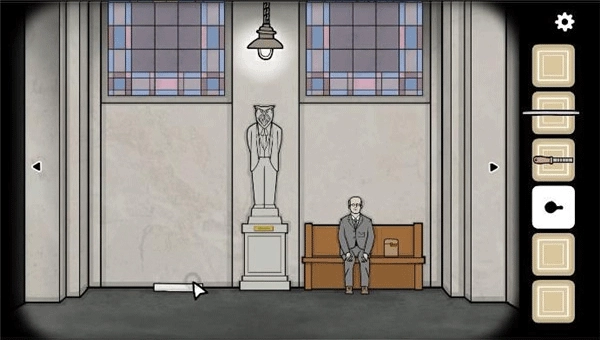 9、前往海报旁的照相馆,安装好把手后拉开帘子,即可得到报纸。将报纸递给坐在长椅上的男子,趁他看报纸时点击他右侧的口袋,就能获取硬币。