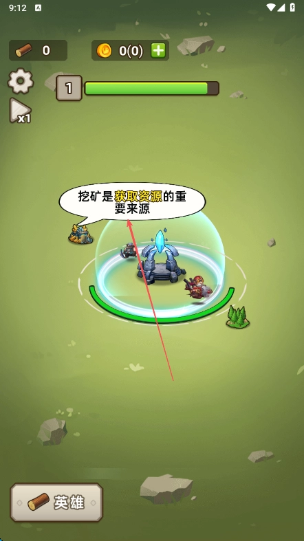 点击屏幕里的英雄,控制它移动与攻击,打败周围的小怪来获取更多资源。