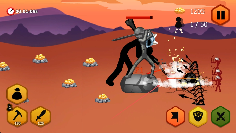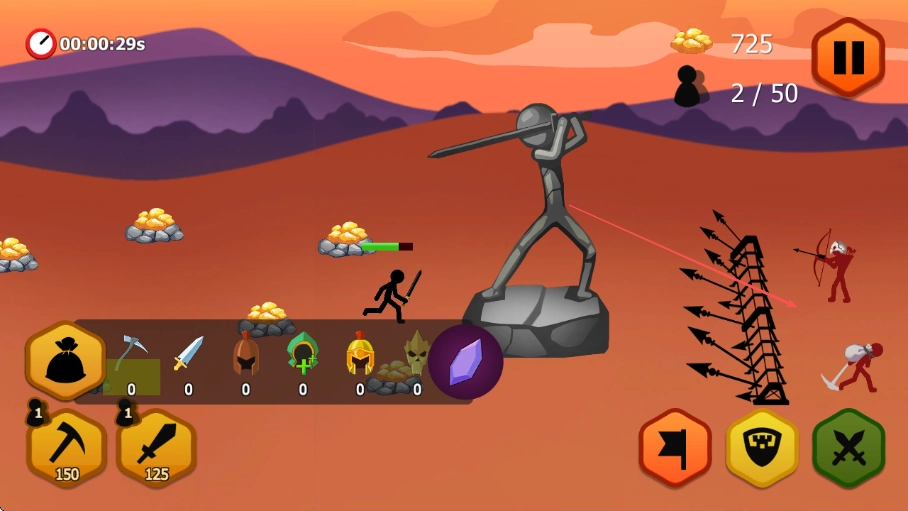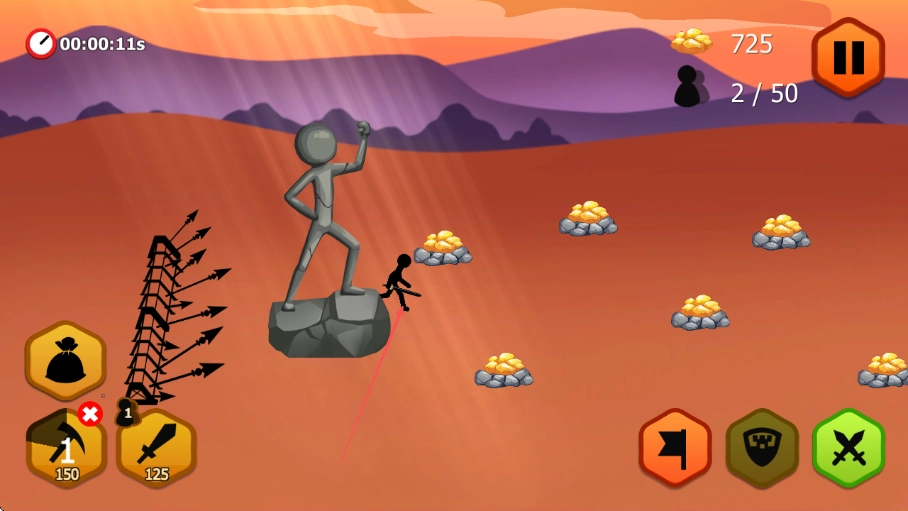 《火柴大战》是一款以火柴人为核心元素的即时策略游戏,每场战斗的核心都聚焦于紧张刺激的军队指挥环节。玩家需要通过精准调度己方部队,击败对手并夺取最终胜利。游戏为每一个关卡都精心设计了独特的地图与剧情,让玩家在策略对抗的过程中,亲身感受到战争的残酷本质。此外,游戏还设有别具一格的决胜局机制:当地图上不再出现新的进攻单位时,所有处于防御状态的单位将自动切换为进攻模式。