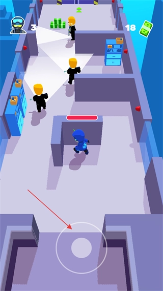 控制蓝色角色,借助场景里的障碍物来避开敌人的视线,悄悄接近目标区域。