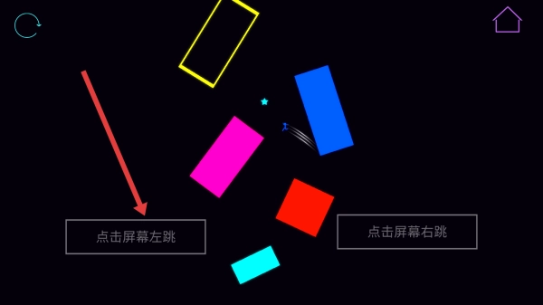 在游戏界面里,按照屏幕上的文字指引点击屏幕左跳区域,控制火柴人往左边跳跃,在各色方块之间穿梭移动,努力达成关卡的挑战目标。