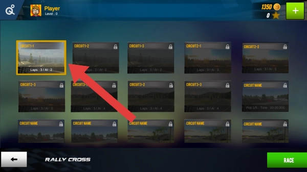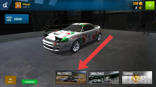 展示了游戏的初始界面,下方设有RALLYCROSS、SINGLERACE、CARRIER三个选项,玩家可依据提示开展操作。
