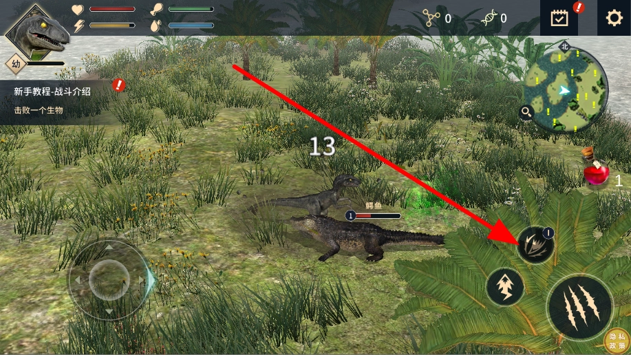 操控恐龙在场景里移动,当碰到目标生物时,点击技能按钮,运用技能对它发起攻击,借助技能效果试着击败该生物,达成击杀任务。
