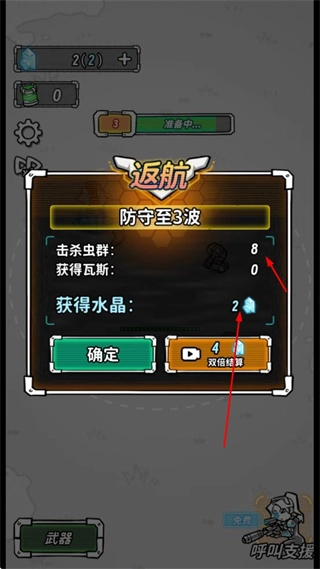 当成功防守到指定波数时,系统会弹出返航界面,该界面会统计本次防守中击杀虫群的数量以及获取的资源等信息,点击确定按钮即可领取相应奖励。