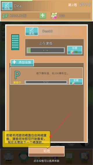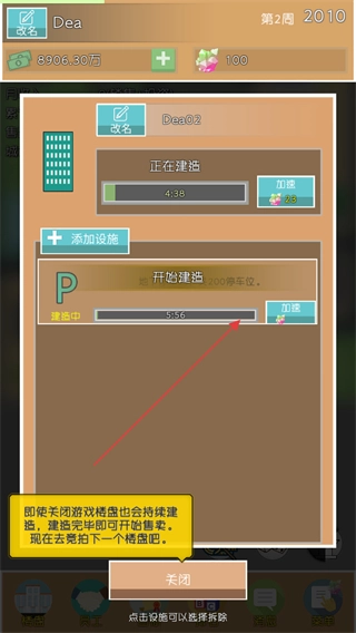 支付费用后楼盘即启动建设,点击加速按钮能够提升建设进度。