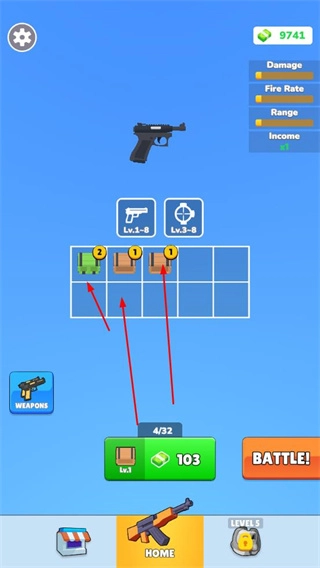 在合成界面,把相同等级的枪械进行合成升级,以此提升枪械的伤害、射速、射程等属性,为跑酷战斗打下基础。