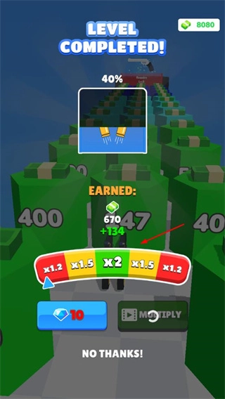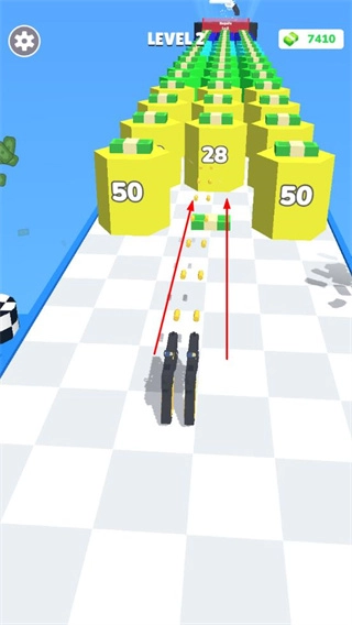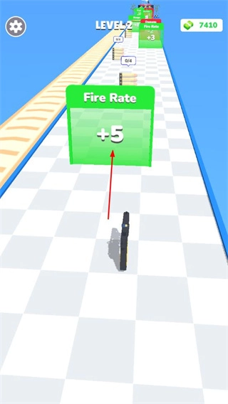 进入跑酷关卡后,你需要操控枪械去收集射速加成之类的buff,以此增强射击能力,另外还要击碎金币方块来获取资源。