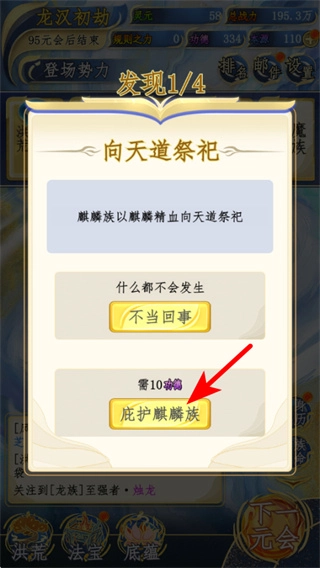 当面对天道祭祀的选择界面时,点击“庇护麒麟族”这一选项,是干预势力事件的核心操作,选择该选项后能够提升对应势力的气运,进而对后续剧情发展产生影响。