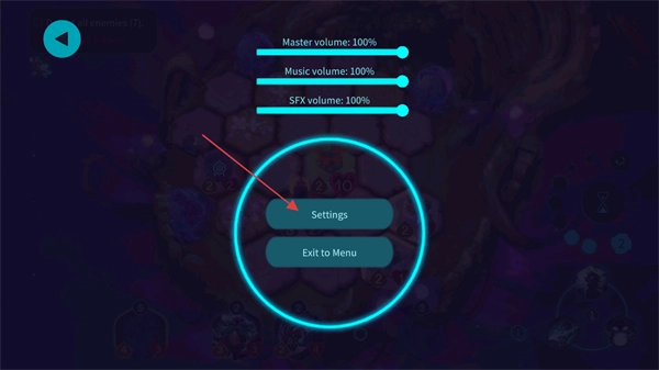 点击菜单后会显示此界面,你可以选择Settings进入设置页面调整各项参数,也能选择ExittoMenu回到主菜单,此外还可以调节各类音量的数值。