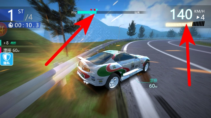 比赛时要留意进度条和车速,通过漂移来维持领先的排名。